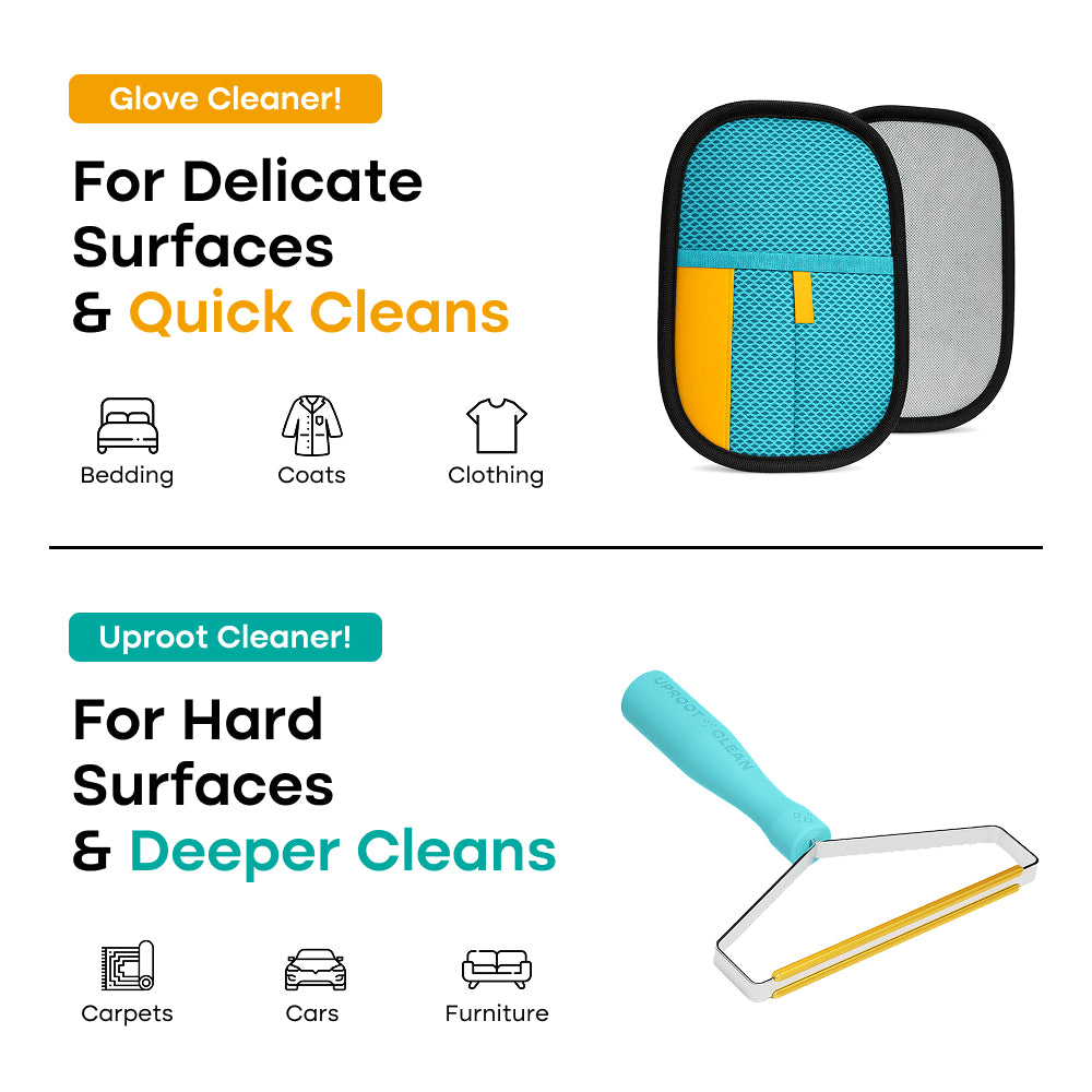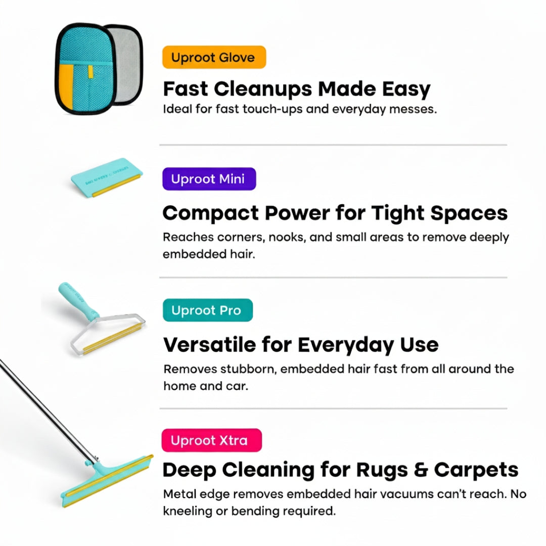 Meet the Uproot Cleaner Pro, Mini, Xtra and Glove Bundle - your unstoppable team against pet hair. The viral Pet Hair Remover Glove grabs every loose strand from couches, clothes, and car seats, leaving surfaces instantly refreshed. Then the Uproot Cleaner Pro, Mini, and Xtra dive deep into fibers of all kinds — from carpets and furniture to hard-to-reach corners and car mats - pulling out the stubborn, embedded hair your vacuum leaves behind. Together, they don’t just clean, they reset your home to a spotless, hair-free space you can finally relax in.